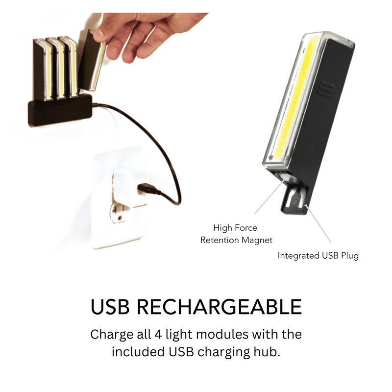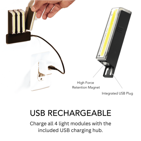 - USB-oplaadbare LED-modules met tot 36 uur batterijduur